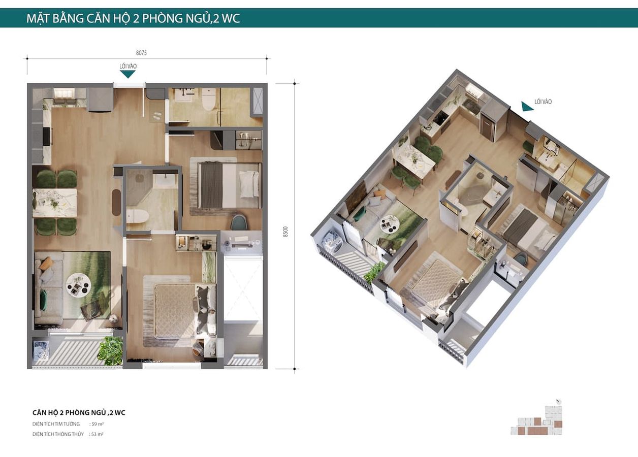 Căn 2PN 2WC: diện tích khoảng 57 m², giá bán từ 2,56 tỷ đồng/căn